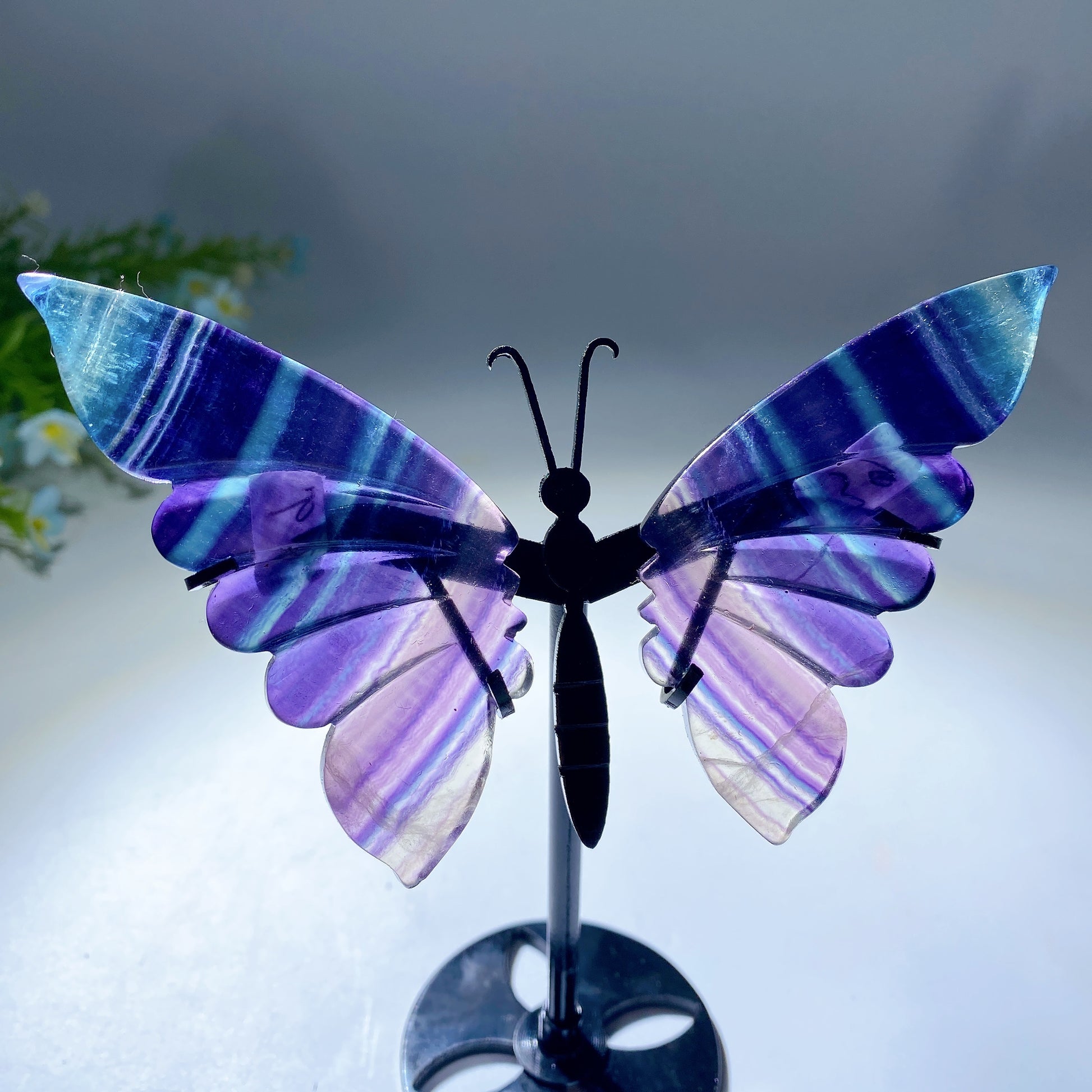 12-22cm Rainbow Fluorite Butterfly Wings Carvings with Stand Free Form
