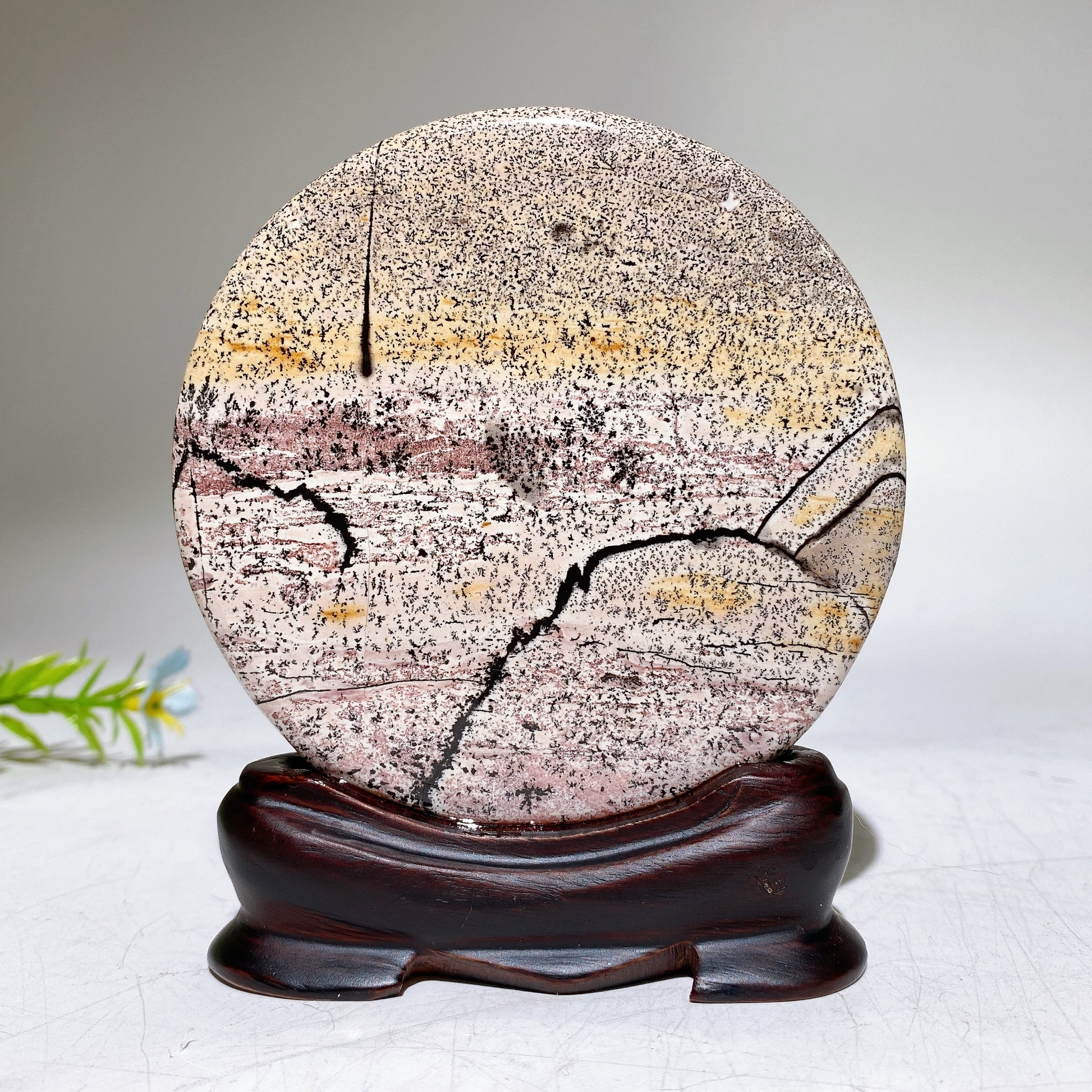 3.7" Picture Jasper Round Slab with Wooden Stand Crystal Healing Bulk Wholesale