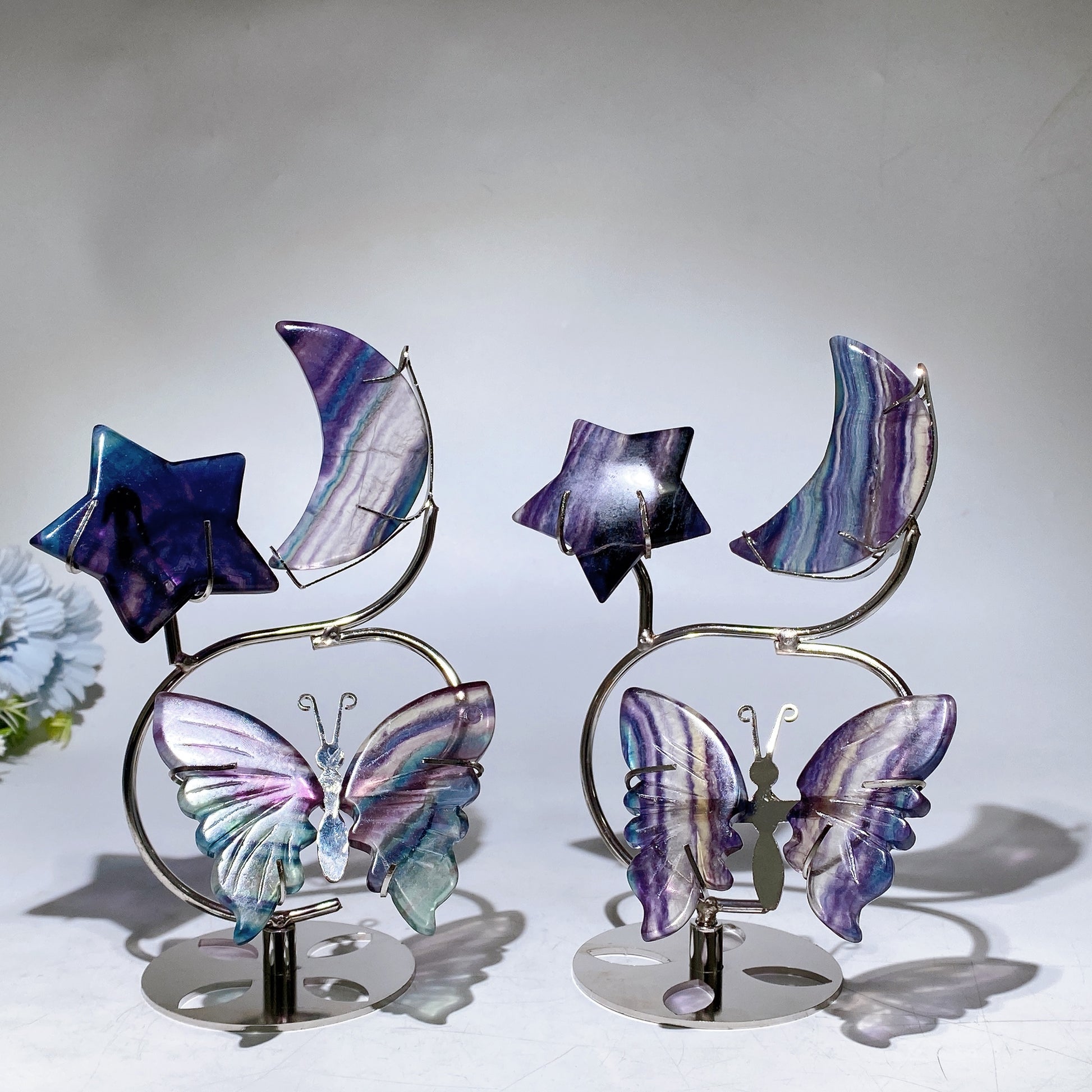 Rainbow Fluorite Moon Star Butterfly Wings Carving with Stand Crystal Healing Bulk Wholesale